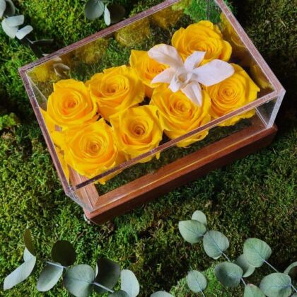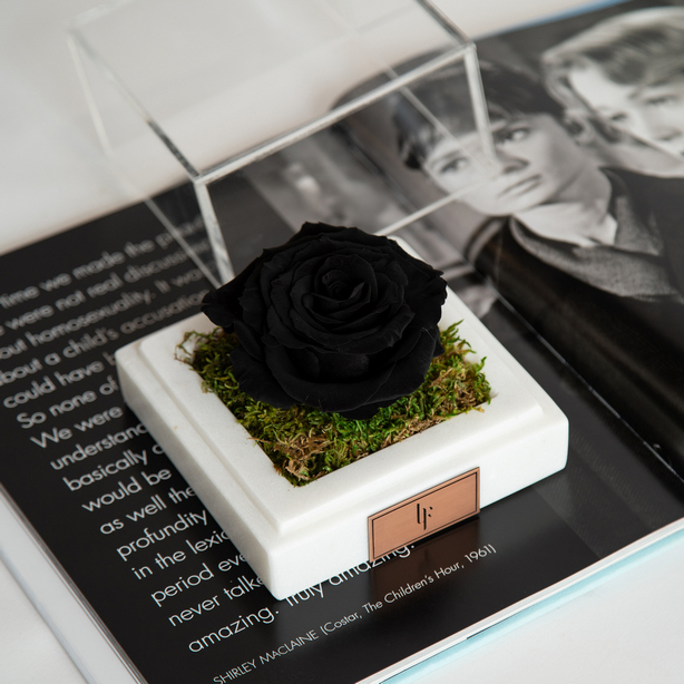 Floral composition of infinity rose in a white marble box.