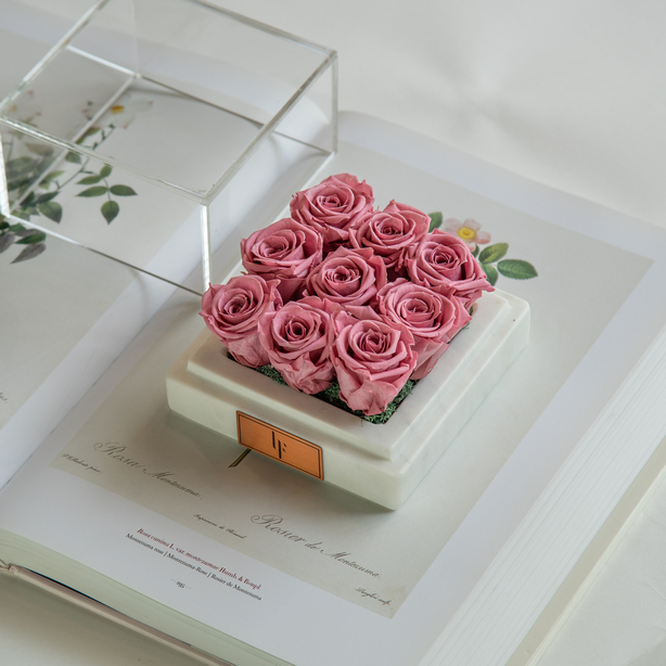 Floral composition of infinity roses in a white marble box.