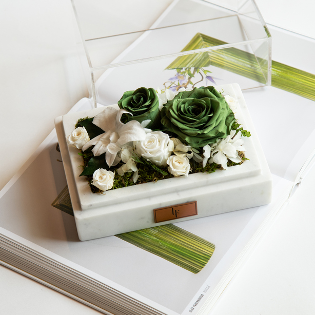 Floral composition of infinity roses in a white marble box.