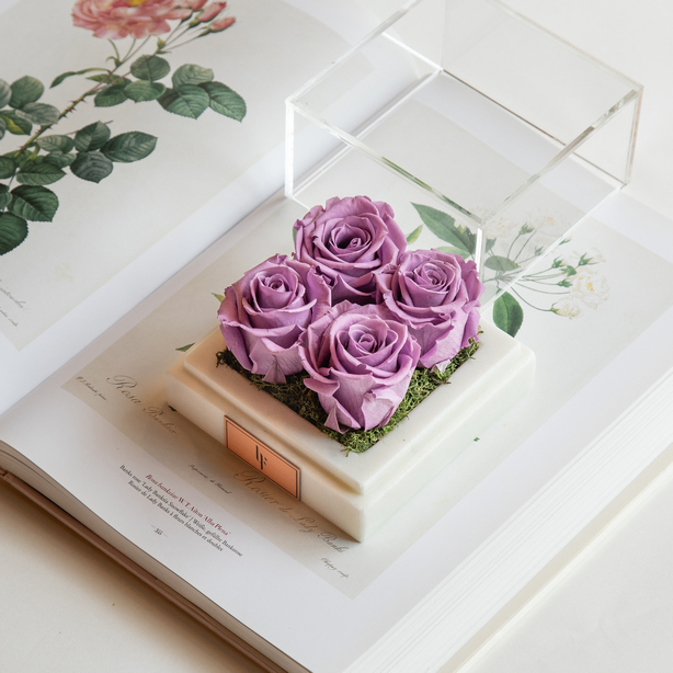 Floral composition of infinity roses in a white marble box.