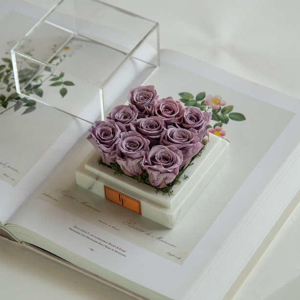 Floral composition of infinity roses in a white marble box.