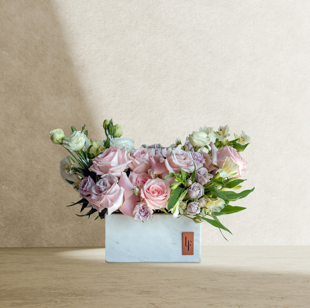 A harmonious blend of delicate blooms and refined marble craftsmanship creates a captivating centerpiece, infusing any space with timeless elegance and tranquility.