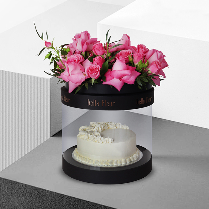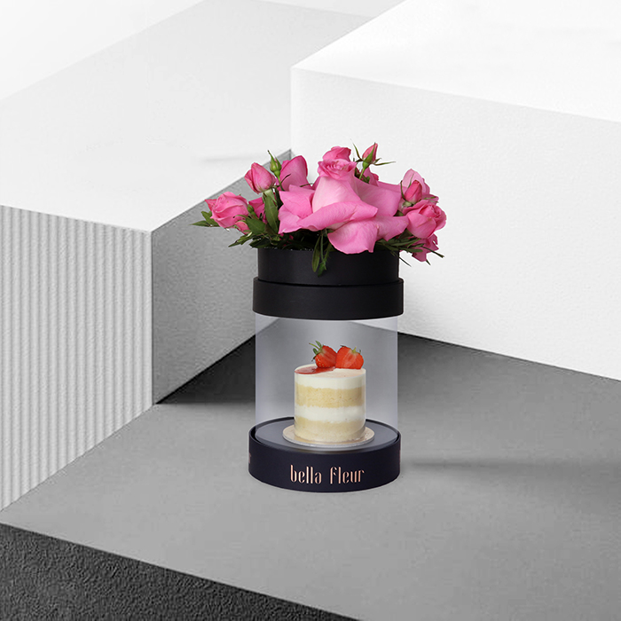 What can be softer than a bouquet of pink roses? A bouquet of pink roses with a vanilla cake slice. Blush Fudge Delights is a perfect gift for children or the elderly. Wedding is another occasion to be complemented by the cake box. The bouquet itself combines 9 fresh medium-size pink rose buds with a couple of long green leaves. It creates a perfect background for the main blossom. In the transparent case underneath, a soft cake sponge with delicate vanilla cream and strawberry slices on top. Together it creates a very graceful composition that can be enjoyed both visually and gastronomically.