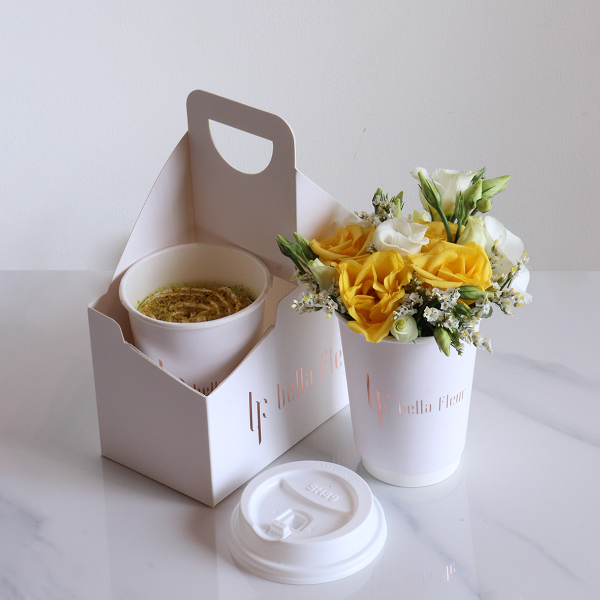 Indulge in the perfect pairing of delicious Pistachia Milk Cake with a cup of fresh spray roses and lisianthus flowers. A delightful treat for your taste buds and a feast for the eyes. Enjoy the harmony of sweetness and beauty.
