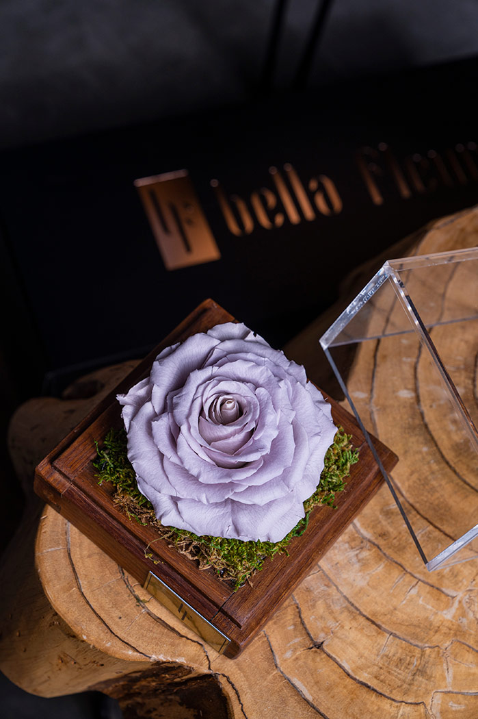 This exquisite floral composition features a single infinity purple rose presented in a wooden box filled with lush decorative foliage. The box is topped with a removable transparent case, adding a touch of elegance and charm to the arrangement. The vibrant purple hue of the rose symbolizes enchantment, uniqueness, and exclusivity while the sturdy wooden box exudes rusticity and simplicity. Carefully crafted to perfection, this floral masterpiece is a perfect gift for a significant other, family member or friend. Its simple yet timeless beauty will undoubtedly evoke feelings of love and admiration. The attention to detail in the creation of this composition ensures that it will adorn any space with unsurpassed grace and refinement.