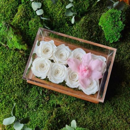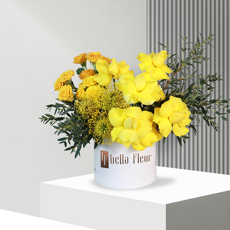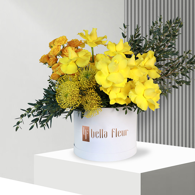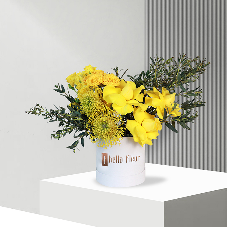 Gifts often brighten the mood, while the best way to brighten the room is Solana Bella Box. This bouquet is a miniature sun made by Bella Fleur florists to warm the hearts of the people of Dubai. The content of the bouquet is 7 elegant yellow roses, 11 small orange rosebuds, and 5 sun-like proteas on the side. Behind this improvised sun green foliage are placed to make a contrasting color. All of these are inside the white eco-friendly box with Bella Fleur logo on it to ensure the fragile plants will not dry during transportation. It also helps to maintain high humidity at the bottom of the stems. Solana Bella Box is a gift for everyone.