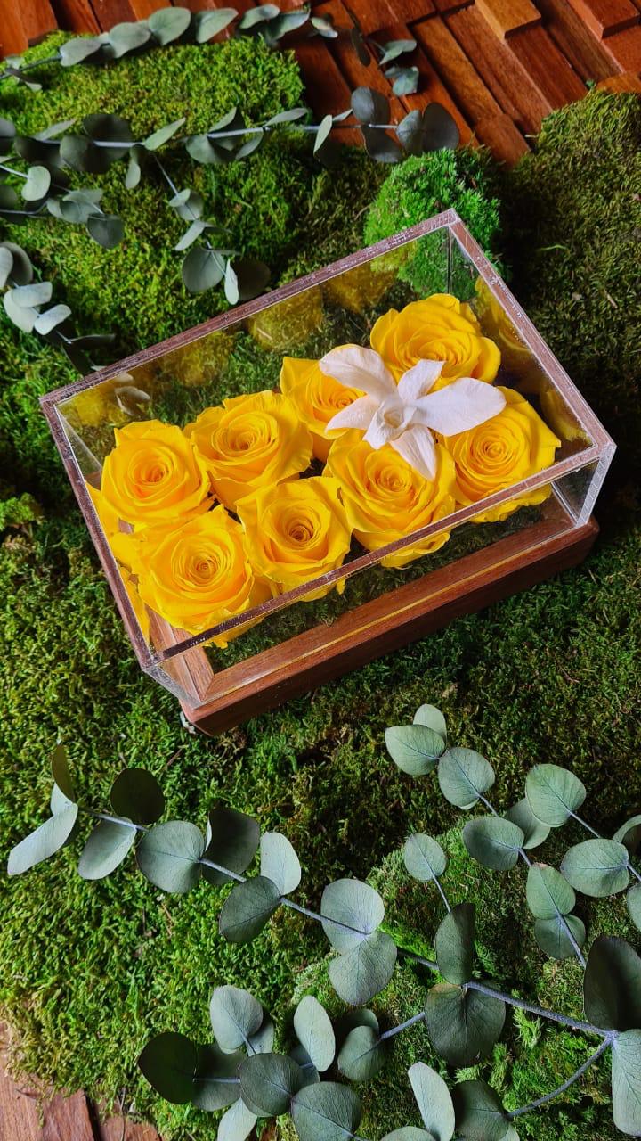Yellow Infinity Ocho floral arrangement exudes elegance and refinement. The wooden box is adorned with decorative foliage, creating an enchanting setting for the flowers. The eight vibrant and infinity yellow roses harmonize gracefully with the single white orchid, which serves as a focal point. The combination of the sun-kissed roses and the delicate white orchid symbolizes friendship, hope, and admiration. The removable transparent case makes this beautiful composition versatile and easy to customize. Whether as a gift for a loved one or to brighten up your own space, this arrangement is a perfect choice for anyone who appreciates natural beauty and artistic craftsmanship.