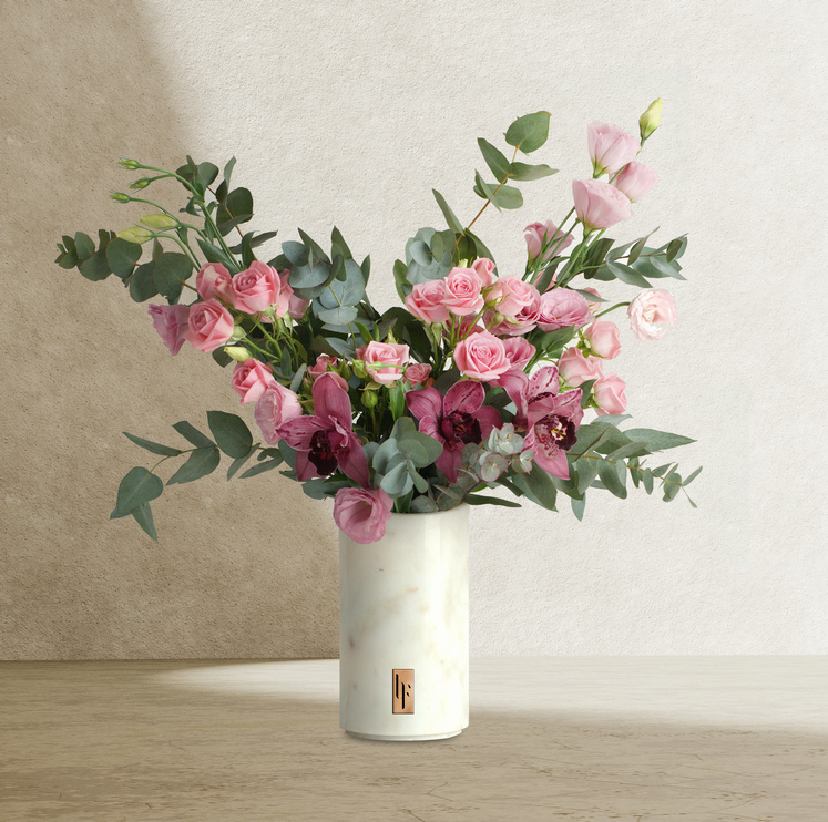 5 spray rose, 4 lisianthus, 1 stem cymbidium, 1 bunch eucalyptus