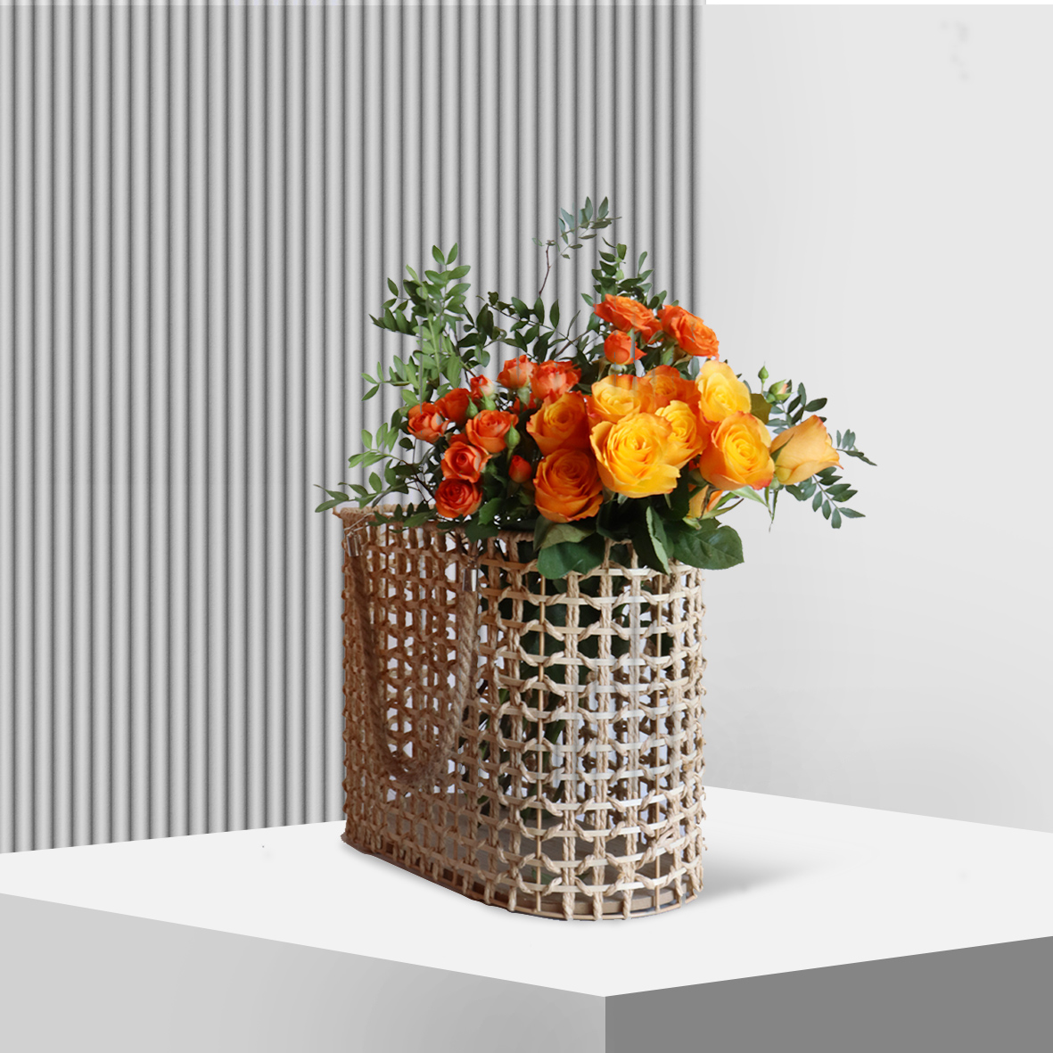 A basket of fresh 10 roses, 3 spray roses and Pistachia