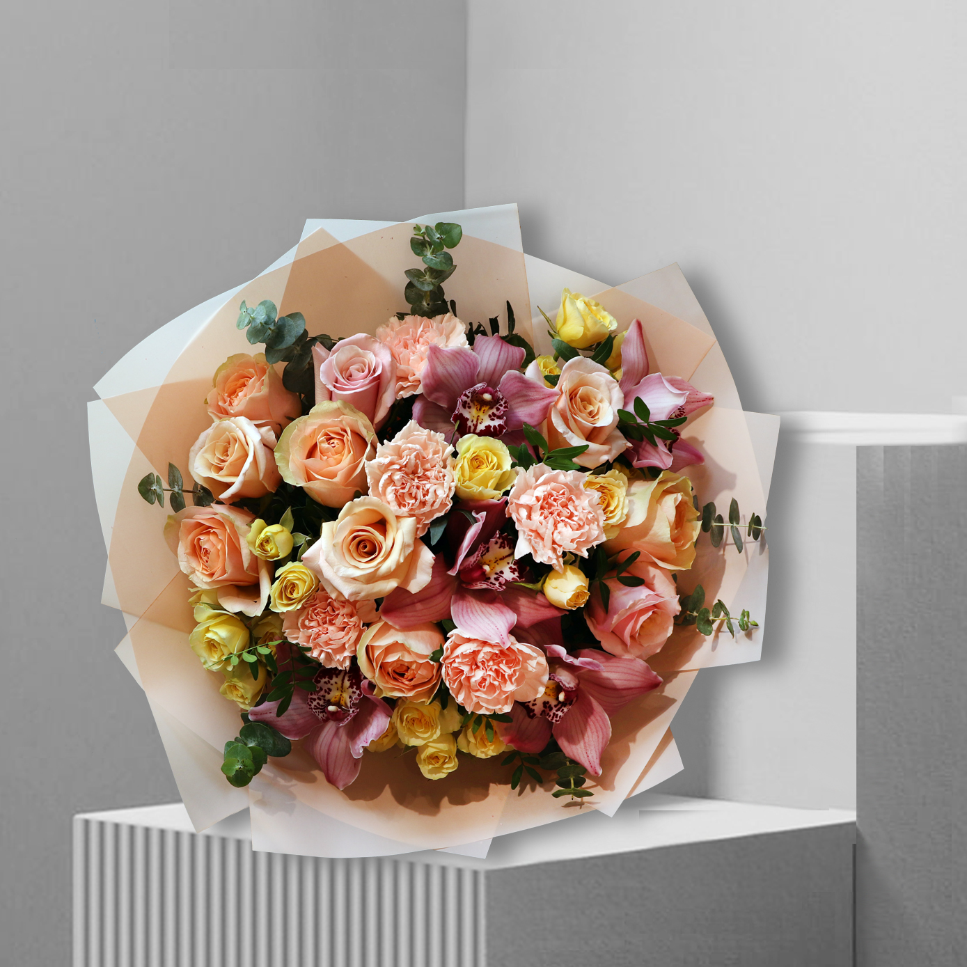 This charming bouquet will be a perfect gift for every celebrating, such as Birthday, Anniversary, Father’s Day, Mother’s Day or Valentine’s Day. Bella Fleur professional florists collected this amazing bouquet consisting of 10 pink roses, with 5 orchids, 5 yellow spray roses, 5 pink carnations, fresh green eucalyptus and pistachia. Bouquet Janini will be a great occasion to tell about your feelings, show attention and respect for darling and dear people. The tender fragrance of orchids, mixed with roses and carnations, create a sense of magic and mystery. Bouquet Janini wouldn’t leave anyone insensitive.