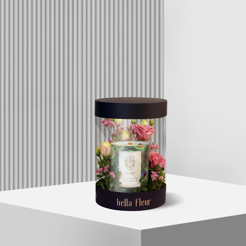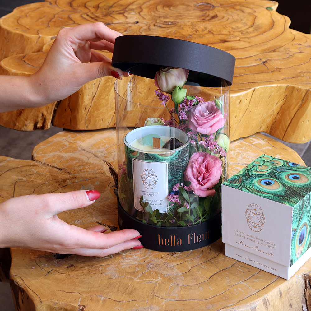 The perfect combination of freshness and relaxation – that’s what this composition of fresh flowers and an aromatic lime and coconut scented candle is all about. Adorned candle with green fluorite and amethyst crystals, this elegant arrangement is sure to impress. Featuring a single lisianthus and a single limonium, this composition is all about quality over quantity. Each flower has been carefully chosen for its beauty, and placed in a stunning box that perfectly complements the colors of the flowers. But the real star of Kiyoma box is the scented candle. With its delightful aroma, it’s the perfect way to relax and unwind after a long day. So why not treat yourself or someone special to this exquisite composition? It’s the perfect way to bring a touch of natural beauty and relaxation into any space.