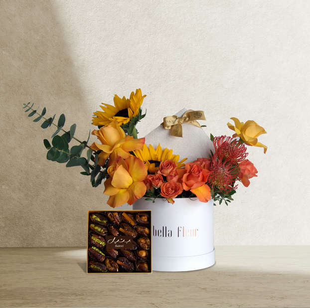 2 Sunflowers, 7 Confidential, 1 Spray Rose, 2 Nutan, Eucalyptus, Pistachia, Small bateel (Premium filled dates : Approx weight 330gms)