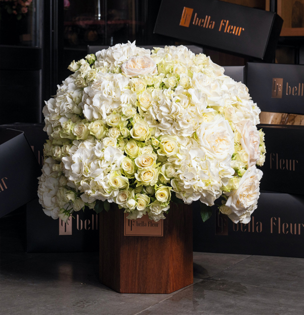 One of the most unique creations of Bella Fleur florists combines 3 different subspecies of roses. Ramadan Fiori 5 is the most elegant product on this website. White roses are the synonym for something pure, innocent and new. This bouquet will be a perfect gift for someone celebrating Birthday, Anniversary, Father’s Day, Mother’s Day, and Ramadan. The only blossom used here is White Rose with 3 different shapes of buds. It is impossible to count all the flowers in the composition as the number easily exceeds 50. Ramadan Fiori 5 rests in a wooden vase with the Bella Fleur logo on it.