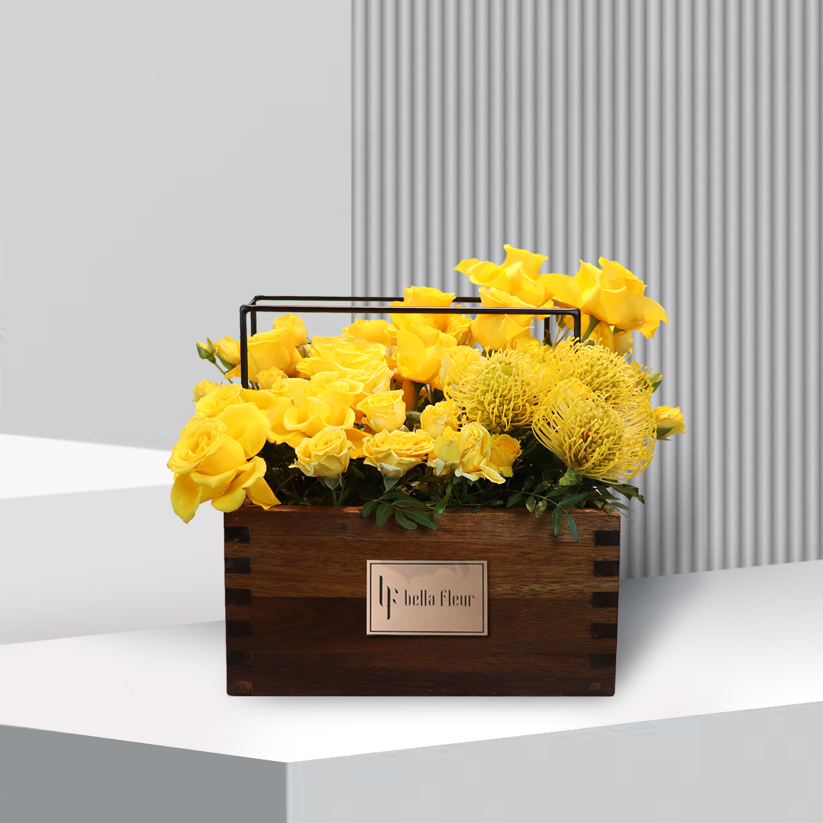 An exclusive arrangement of vibrant yellow flowers in Lakewood box. Available only in Bella Fleur.