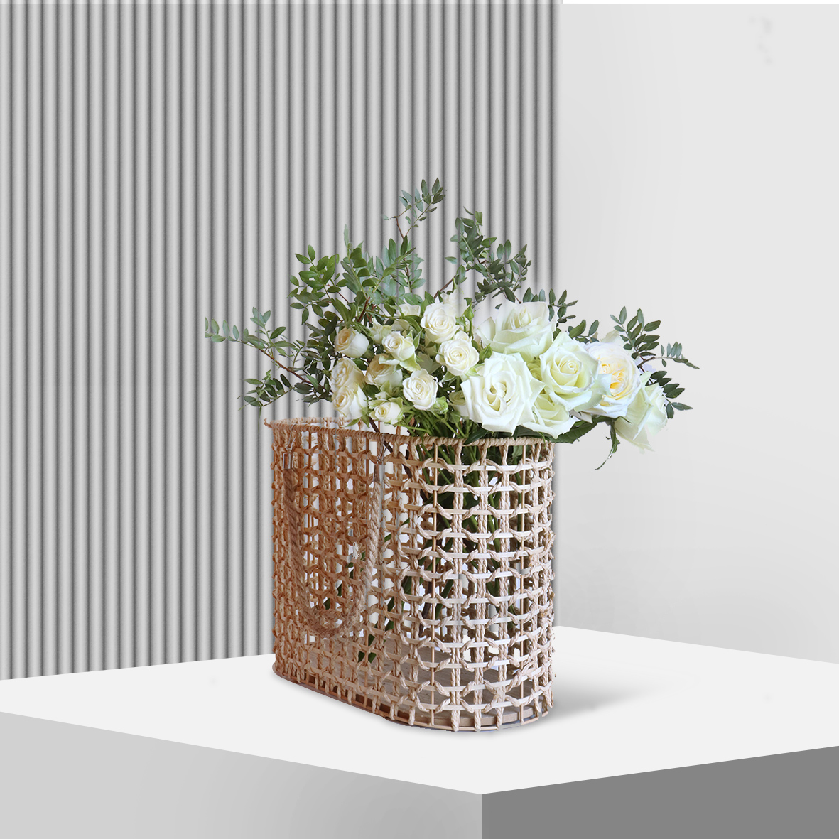 A basket of fresh 10 roses, 3 spray roses and Pistachia