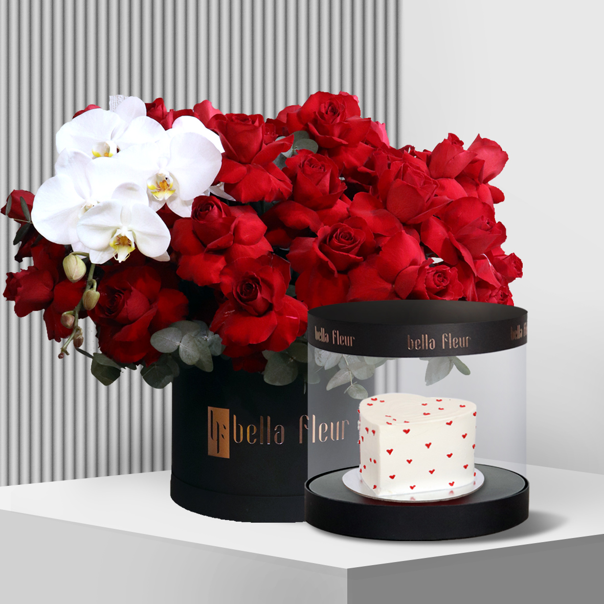 Bella box with roses; 1 orchid stem and 1 bunch eucalyptus+ mini cake; the white heart shape V cakes are chocolate flavor; 500gr