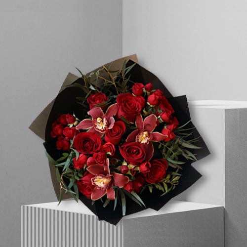 Passionate Rowan bouquet is a stunning combination of three delicate cymbidium flowers, nine rich red roses, and five velvety spray roses. The vibrant hue of the flowers symbolizes love, passion, and intensity, making it an ideal bouquet to celebrate any romantic occasion. The combination of delicate cymbidiums flowers, bold roses and lush spray roses create a perfect contrast, giving the bouquet a unique and stunning aesthetic. The fragrance of the roses and the delicate petals of the cymbidiums make this bouquet not just visually appealing but also a sensory delight. It is a perfect gift to express love, admiration, and appreciation towards your significant other. With the Rowan bouquet, you can make someone feel special, loved, and appreciated in the most elegant way.