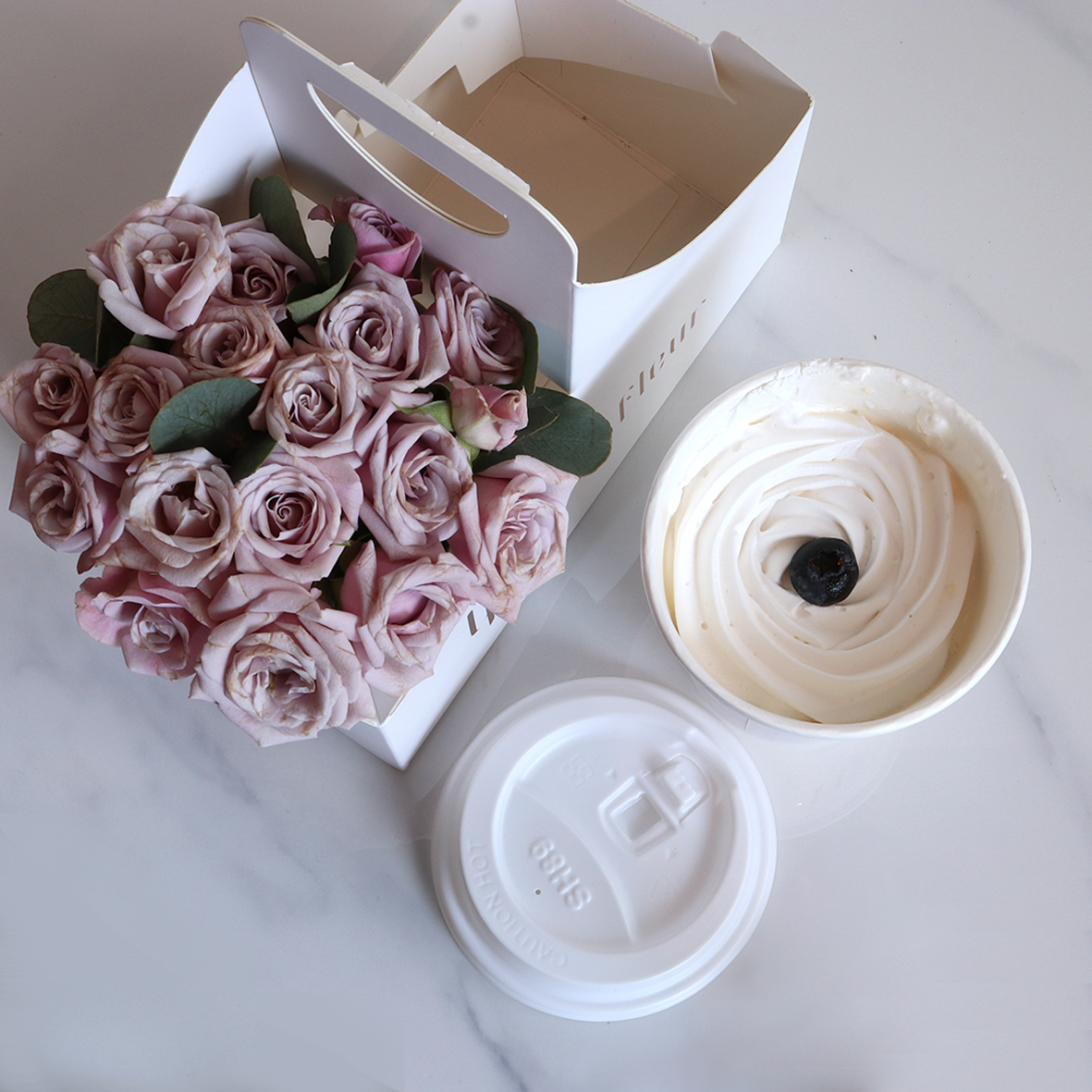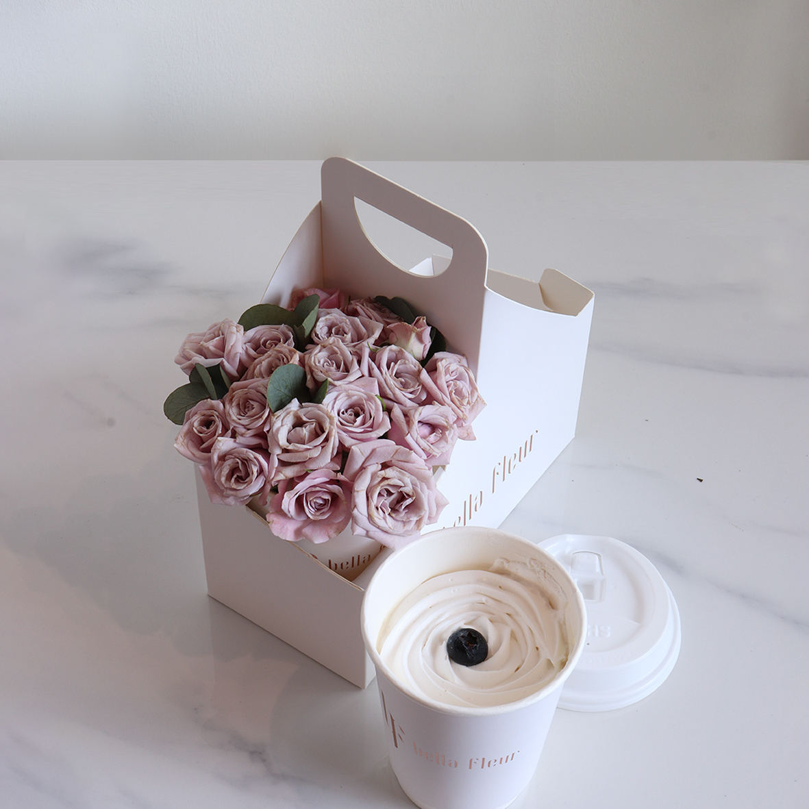 Indulge in the perfect pairing of delicious Vanilla Milk Cake with a cup of fresh purple spray roses. A delightful treat for your taste buds and a feast for the eyes. Enjoy the harmony of sweetness and beauty.