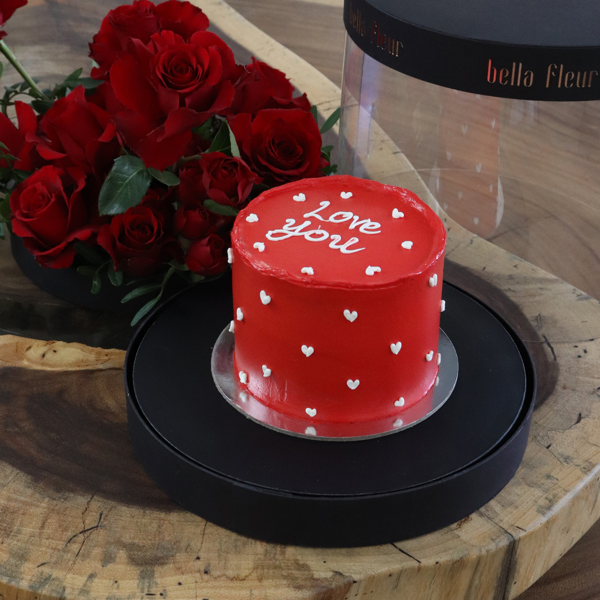 Red flower arrangement + Small heartshape cake; 500gr; taste: red velvet