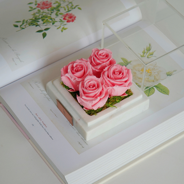 Floral composition of infinity roses in a white marble box.