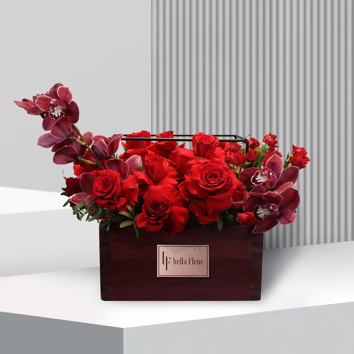 An exclusive arrangement of fresh red flowers in Lakewood box available in Small and Large sizes.