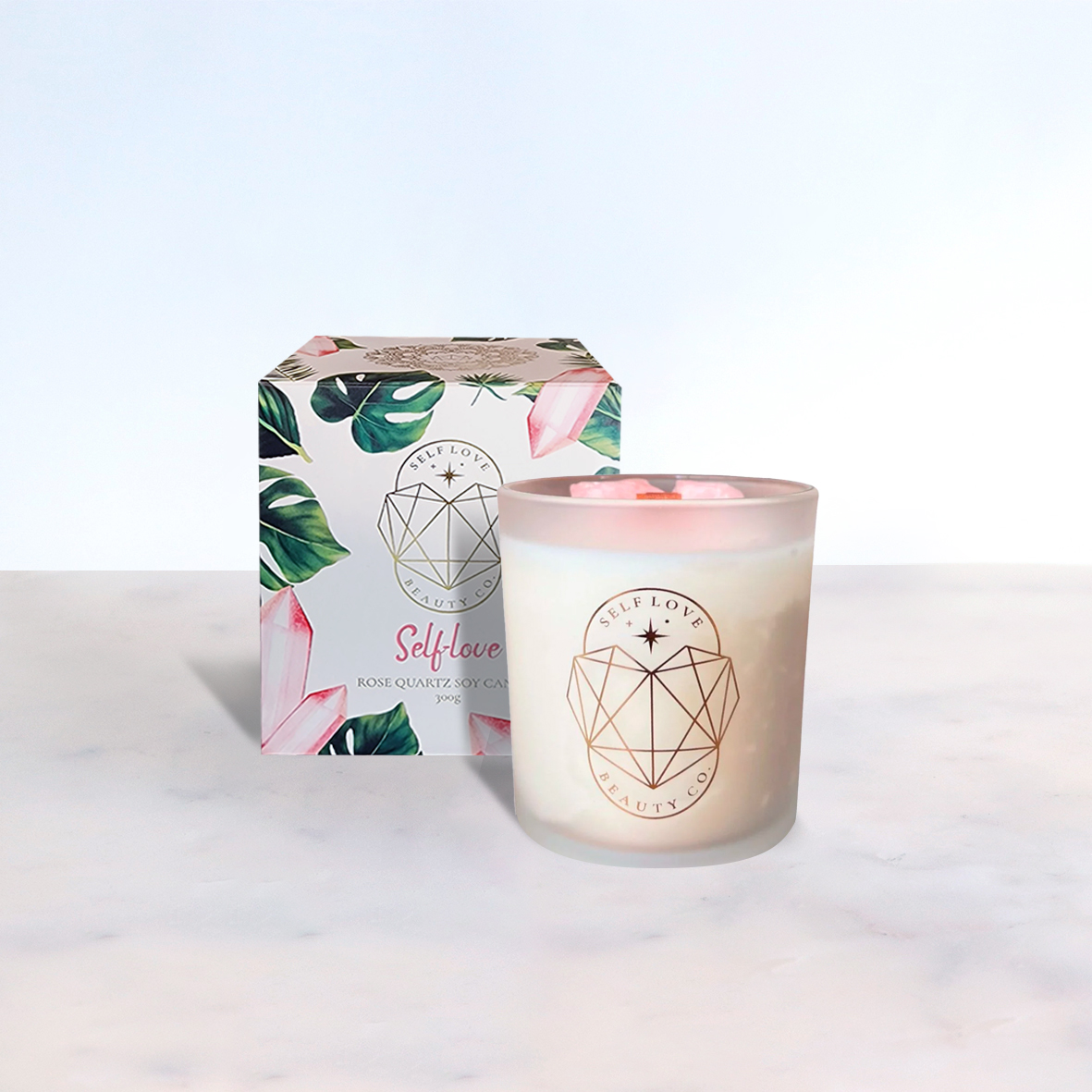 Candle with Rose Quartz crystal for a touch of calming luxury.